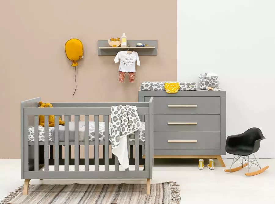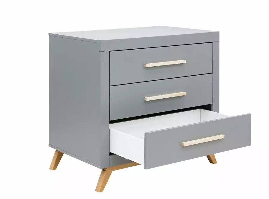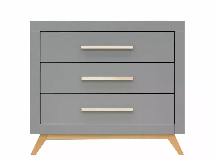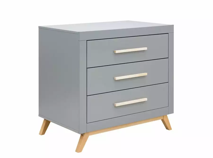 The dresser of the Fenna series has three spacious drawers where you can store a lot. The combination of grey and clear lacquered wooden accents gives this chest of drawers a modern contemporary look. Combine this changing table with the barrier Square for easy changing of the baby. And place the Fenna wall shelf above this chest of drawers for even more storage options. Available separately.