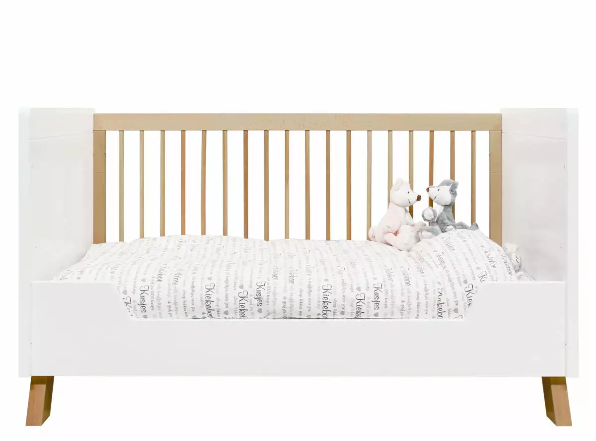 This bed (70 x 140 cm) from the series Lisa can be converted from a bed with bars tot a bench bed. The bed is finished in a combination of white and natural lacquered beech wood. Bed bottom, side rack and lower side for the bench bed are included. Bed bottom of the bed with bars is adjustable in height. The size, 70 x 140 cm, is the same for both beds so that one mattress is sufficient. Note: this bed can not be converted to a cotbed variant, there is always one bar side.