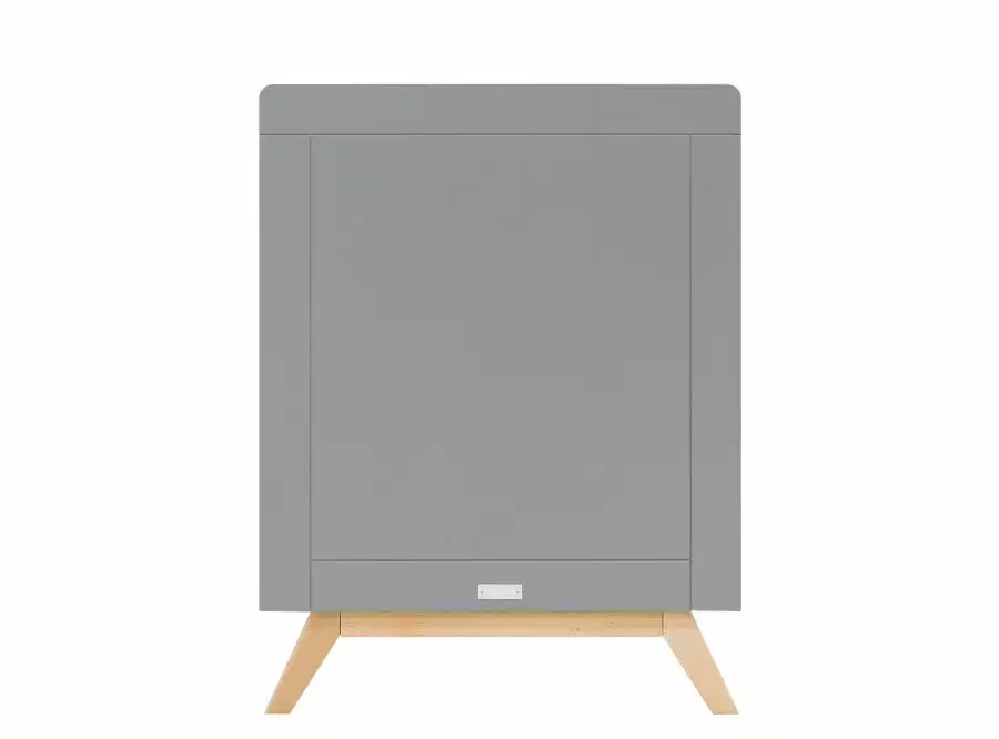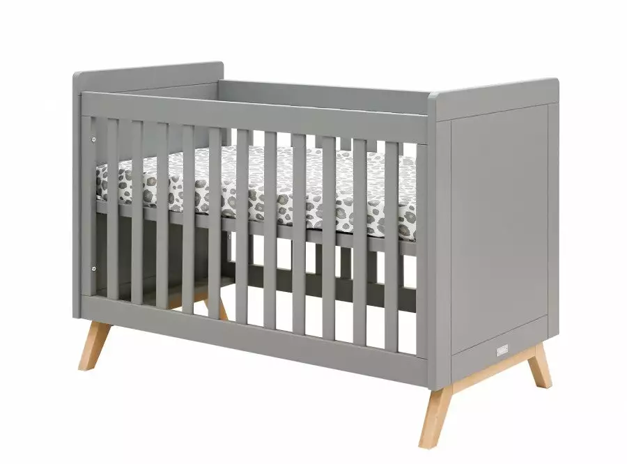 Modern contemporary bed Fenna due to the combination of gray with clear lacquered wooden base. The bed base is adjustable in height, as soon as the baby can pull itself up you can lower the floor for extra safety. Combine this bed with the other furniture in the Fenna series.