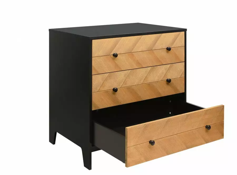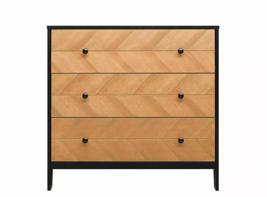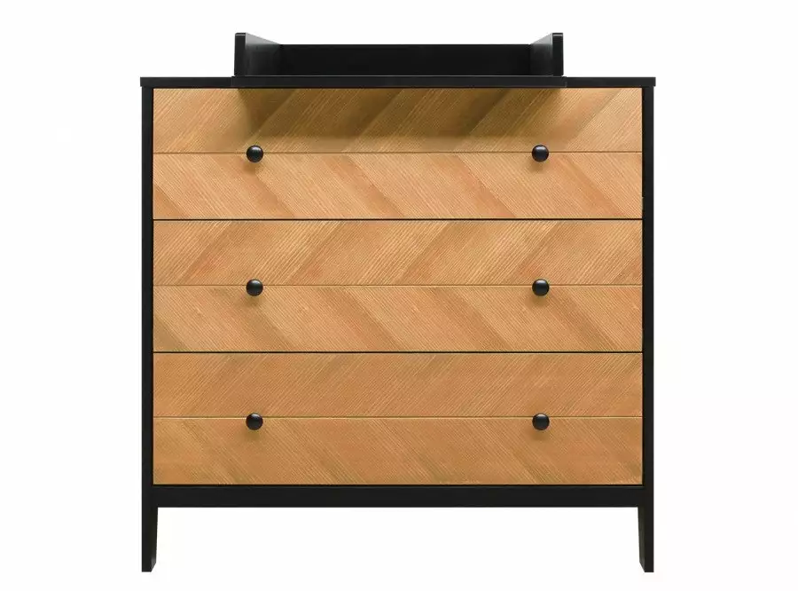 In a cool combination of matt black and veneered wood. Combine this changing table with the barrier Bo, so that you can change your child safely. Place the Job wall shelf above this chest of drawers to easily have things at hand. Since it is a natural product, the wood structure can differ per piece of furniture in the Job series.