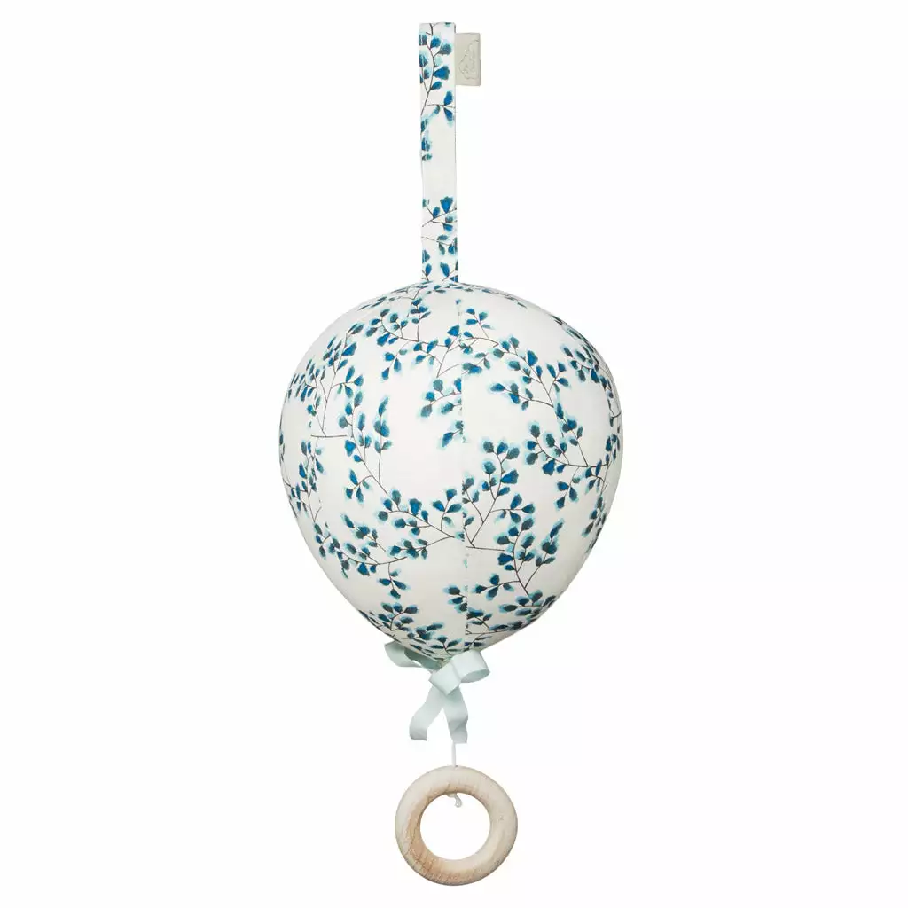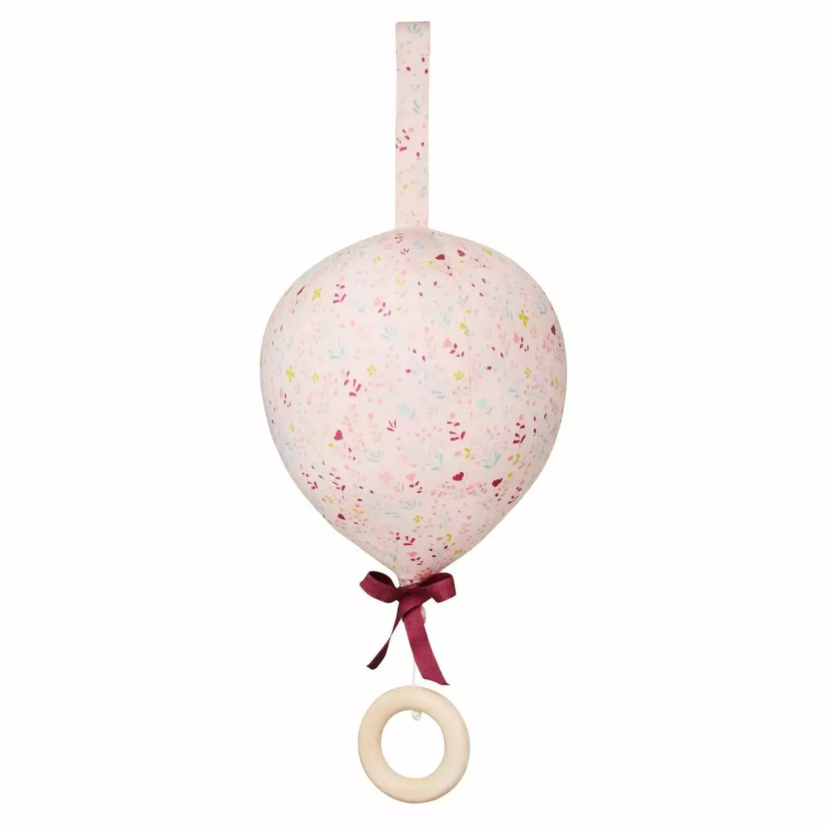 The mobile is shaped as a balloon with a little bow in cotton tape. Pull the wooden ring, and the music starts.