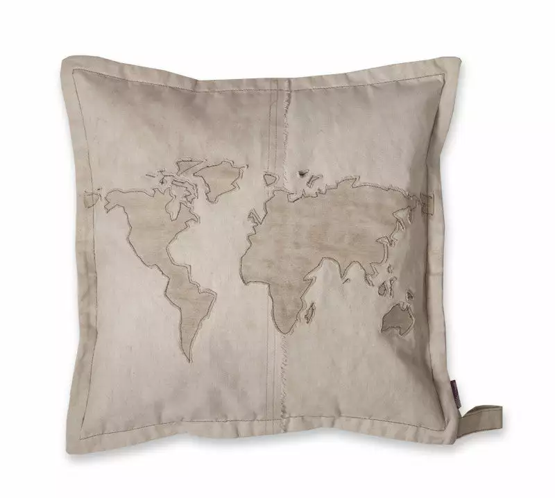 Canvas cushion cover with globe application and a loop at one of the edges. Zipper at the backside.