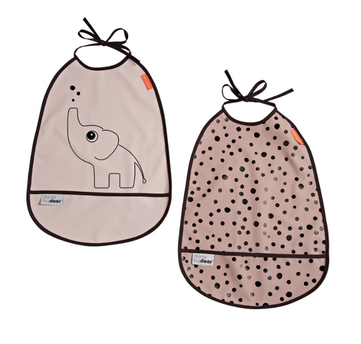A set of two long pocket bibs. Let sweet Elphee and Happy dots keep your little one dry at meal time.