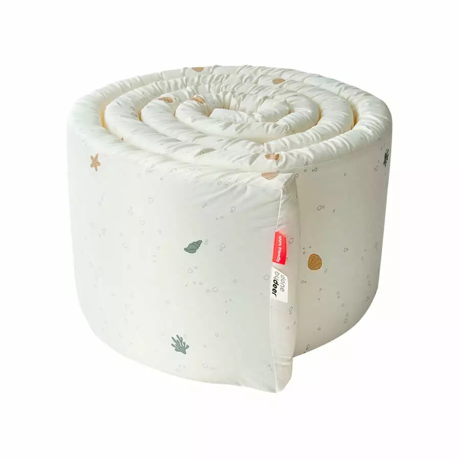 The cot bumper has an overall soft sandy beige tone with the ocean life elements in a mix of mustard and green colours.