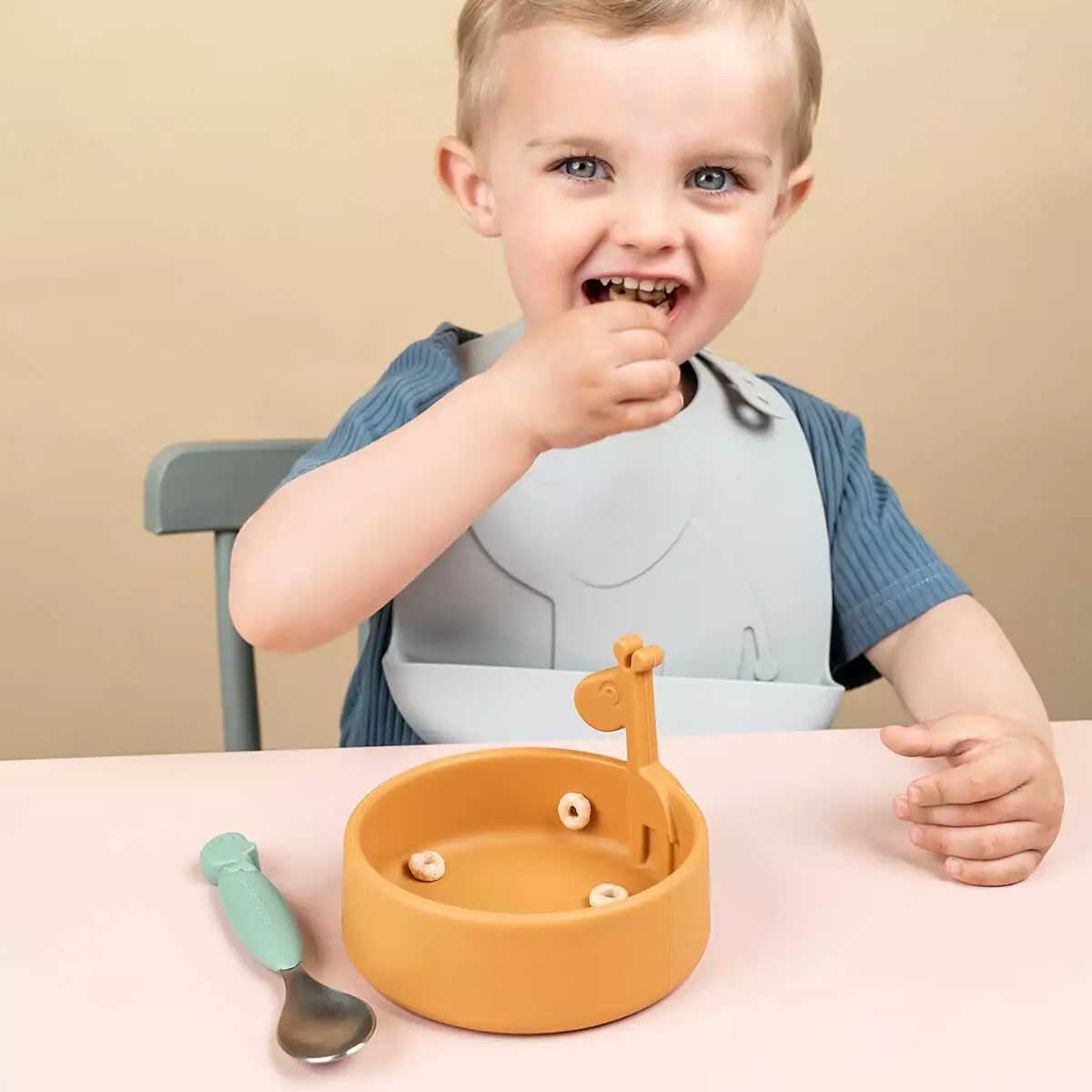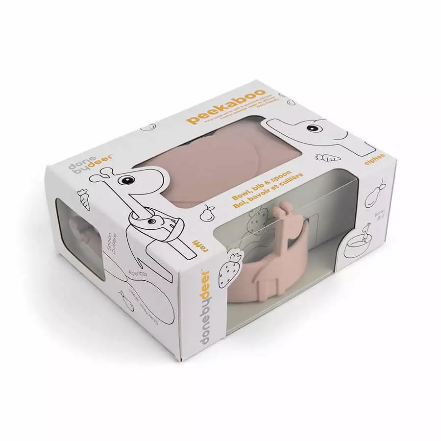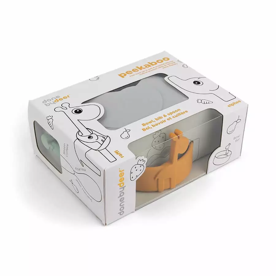 The Peekaboo first meal set is designed to trigger the curiosity of little eaters. Elphee, Raffi and Wally peek out from the dinnerware – making mealtime an extra fun time of the day. A perfectly sized dinner set for learning to self-feed.