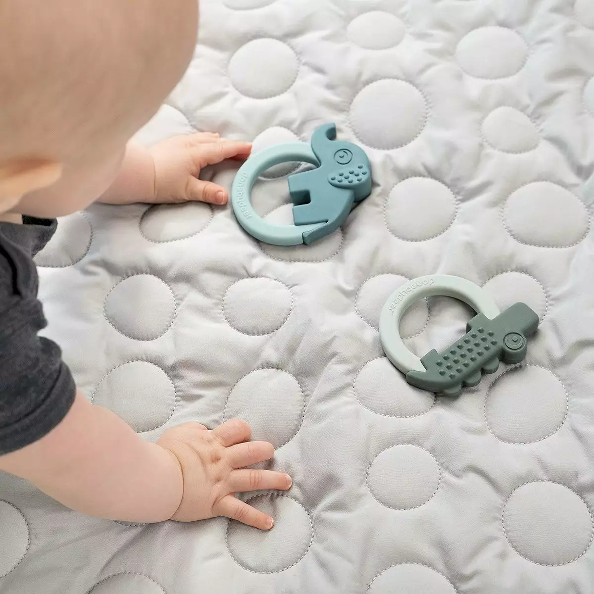 The teether set is designed to fit even the tiniest hand and stimulates both the visual, oral, and tactile senses of the baby. Shades of soft blue and green, fun textures, and the cute elephant and fun crocodile make this set the perfect first toy.