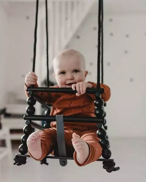 Nostalgic wooden swing in an updated version. Great for baby’s motor skills! Wooden pearls on the front. The swing is solid with good back support. Easily attached to swing hangers in the ceiling or doorframe.