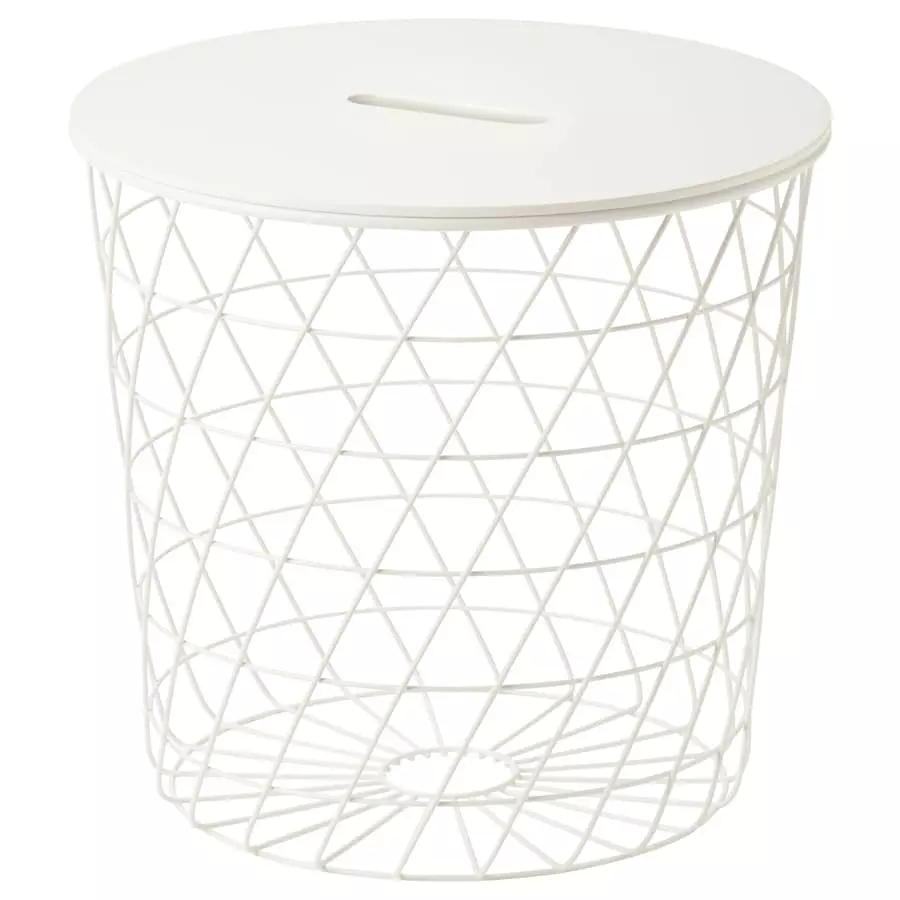 A handle in the tabletop makes it easy to open and get to things stored in the basket.