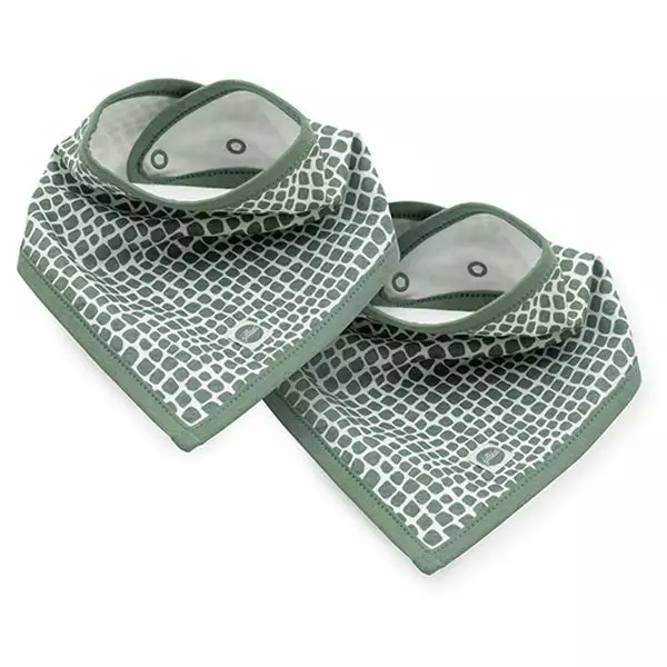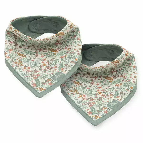 The bandana is packed per 2 pieces and can be closed with a press stud. The dimensions are 37×24.5 cm. The bib is made of jersey cotton and is also available with a floral print.