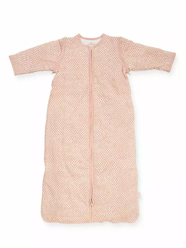 Beautiful sleeping bag with detachable sleeves from Jollein. The baby sleeping bag has detachable sleeves and a TOG value of 2.0. The sleeping bag is available in green and pink in the sizes 70 cm, 90 cm and 110 cm. The sleeping bag is made of cotton and lined with polyester fiberfill.