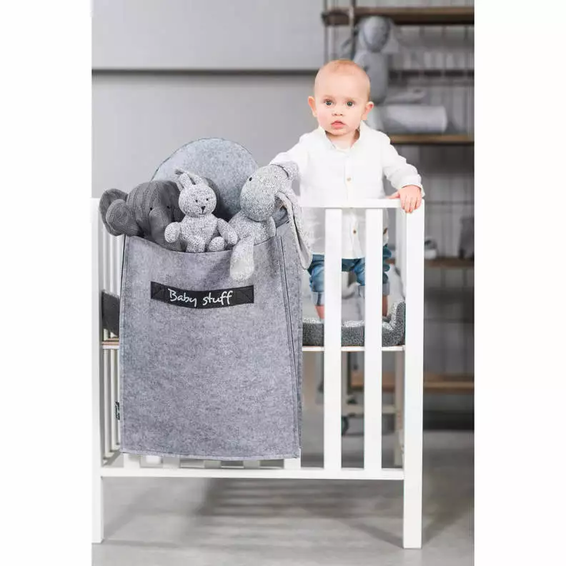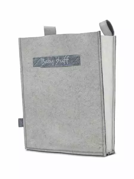 Stylish storage bag for a cot or playpen to store toys and cuddles. The color of this storage bag is sand or grey and the dimensions are 40x50x18 cm. It is made of felted polyester, it feels wonderfully soft.
