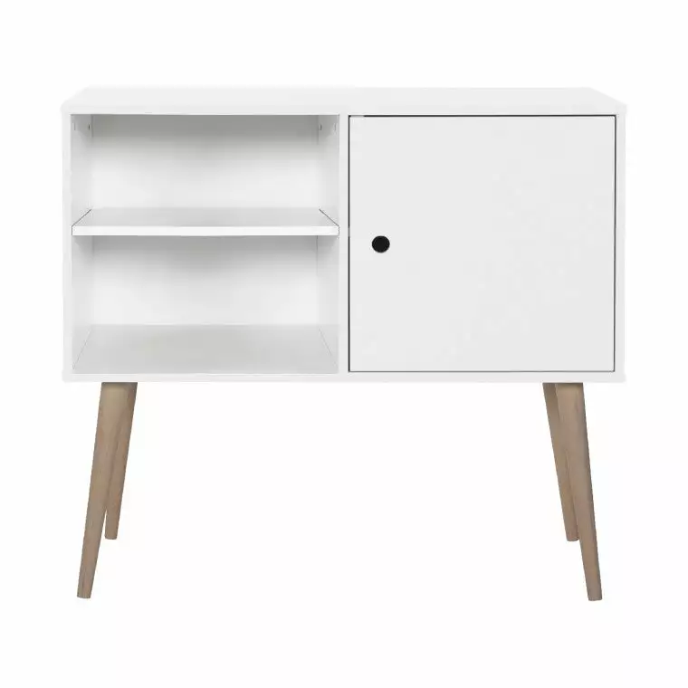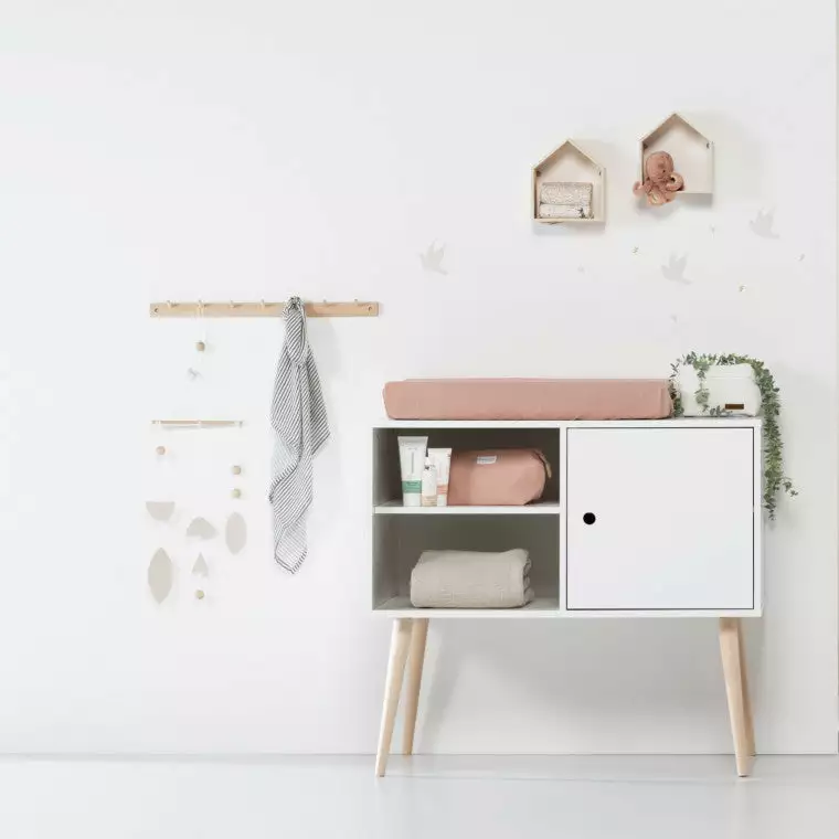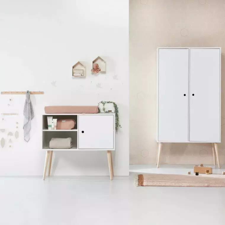 The chest of drawers has a door with a shelf in which you can store a lot and 2 open shelves. You can perfectly place a changing pad on the top. Furthermore, the chest of drawers is made of high-quality material and meets the European safety standard.