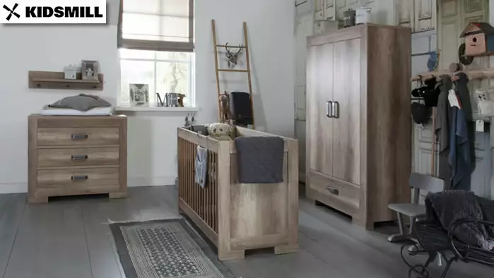 There are endless possibilities with the Kidsmill Lodge nursery furniture collection. This baby room is available with wardrobes and cots in various sizes so that you can put together a room that fits the space you have available. In addition, items for a cool teen room are also available in this series.