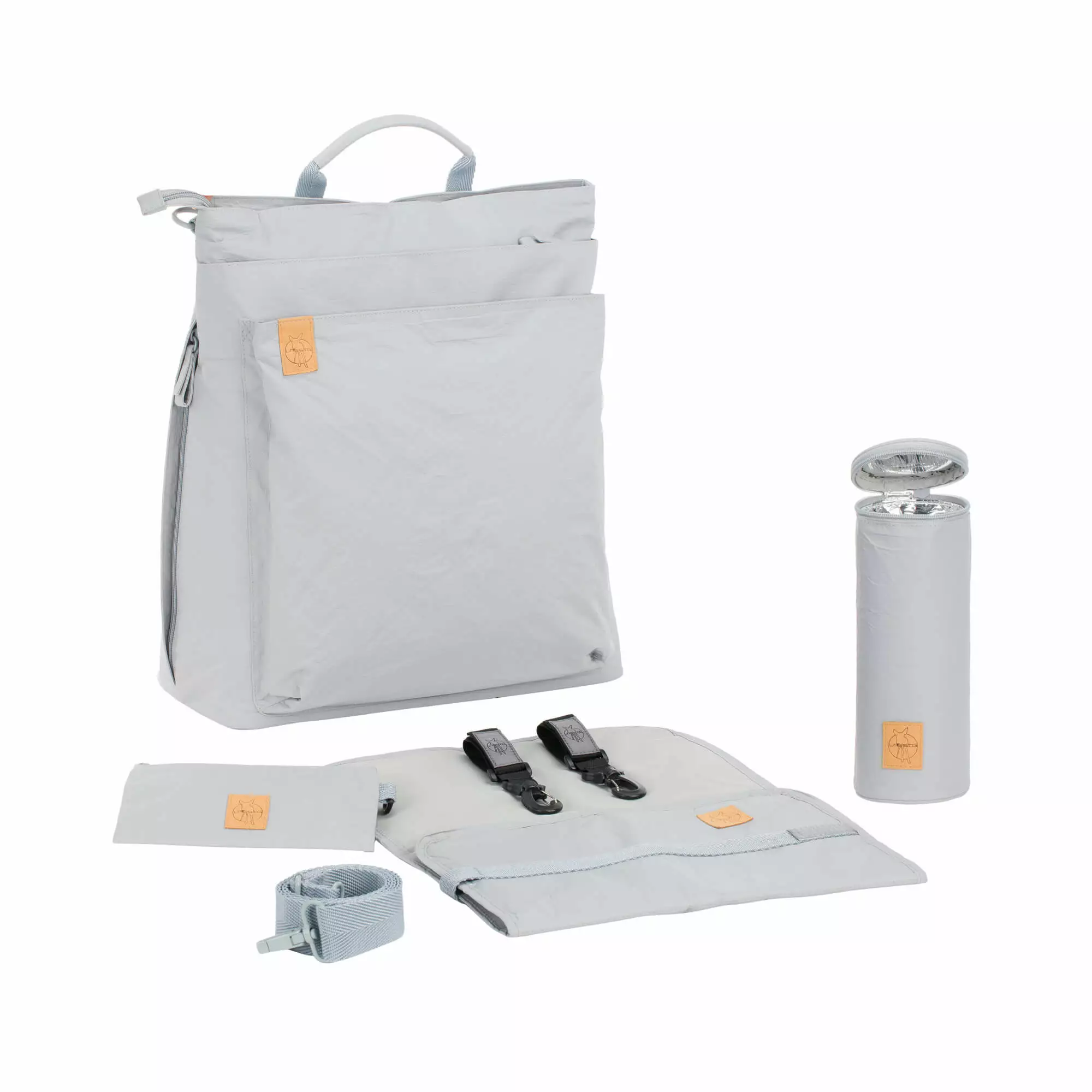 The diaper backpack also includes practical accessories. Among these are a water-repellent changing mat, an insulated bottle holder and a stroller/baby carriage attachment. The extensive range of accessories can be removed when required. This makes the bag an ideal companion during and after the diaper phase.