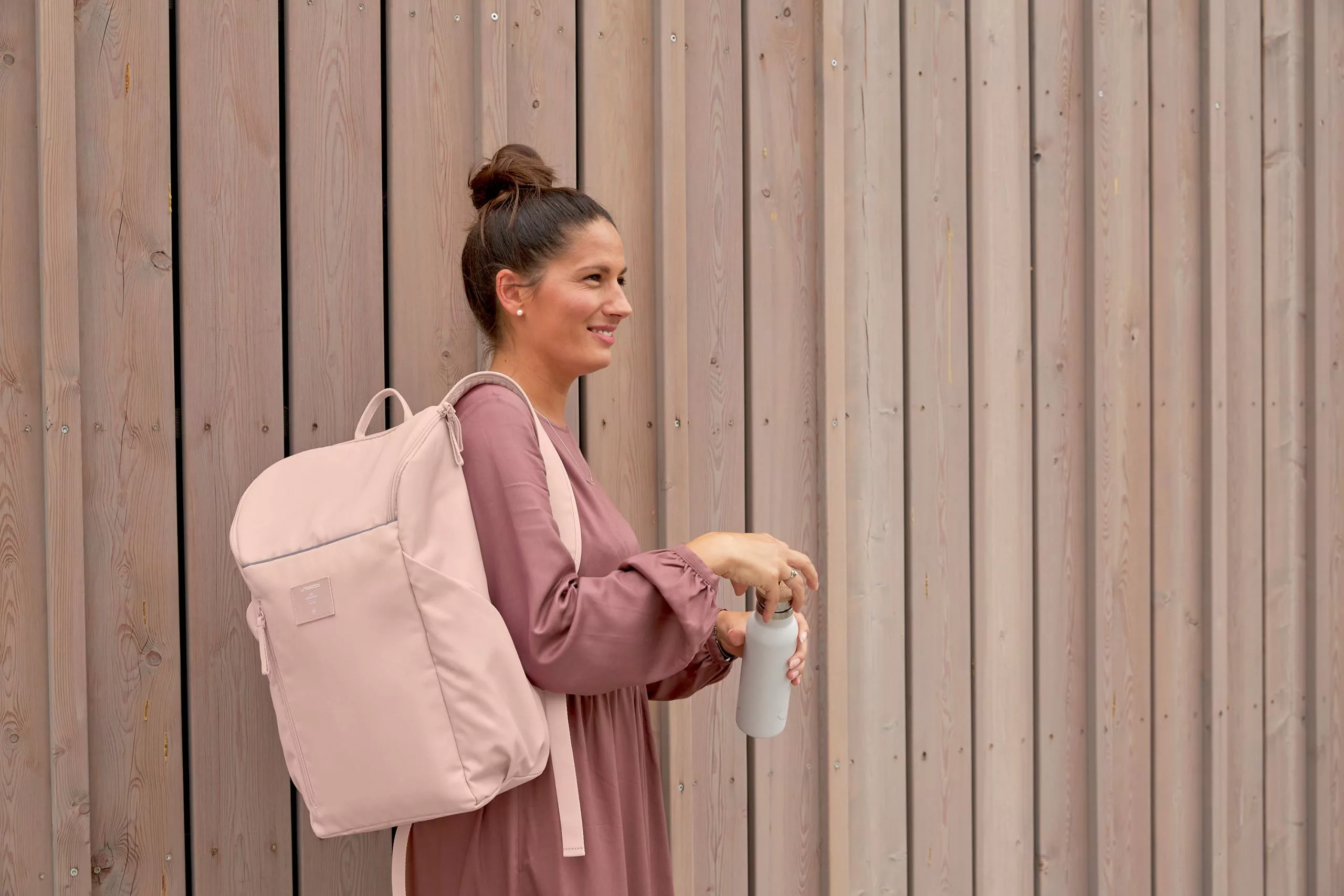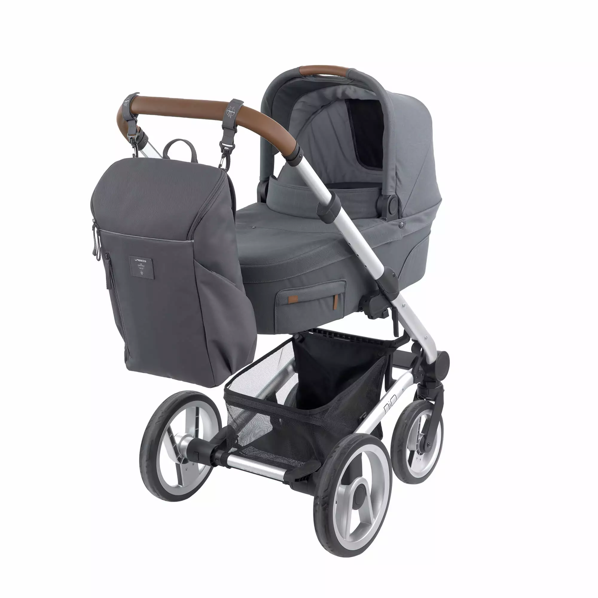 In addition to its large main compartment, the Slender Backpack offers many other useful compartments and practical diaper changing accessories. The water-repellent compartment on the front of the backpack is ideal for stashing damp clothing away until you get home. Meanwhile, drinking bottles, keys and other valuables are safely stowed away in the angled side pockets. Equipped with a water-repellent changing mat, an insulated bottle holder, a holder for food jars, a stroller attachment and a pocket for small items, you have everything you need when you and your baby are out and about.