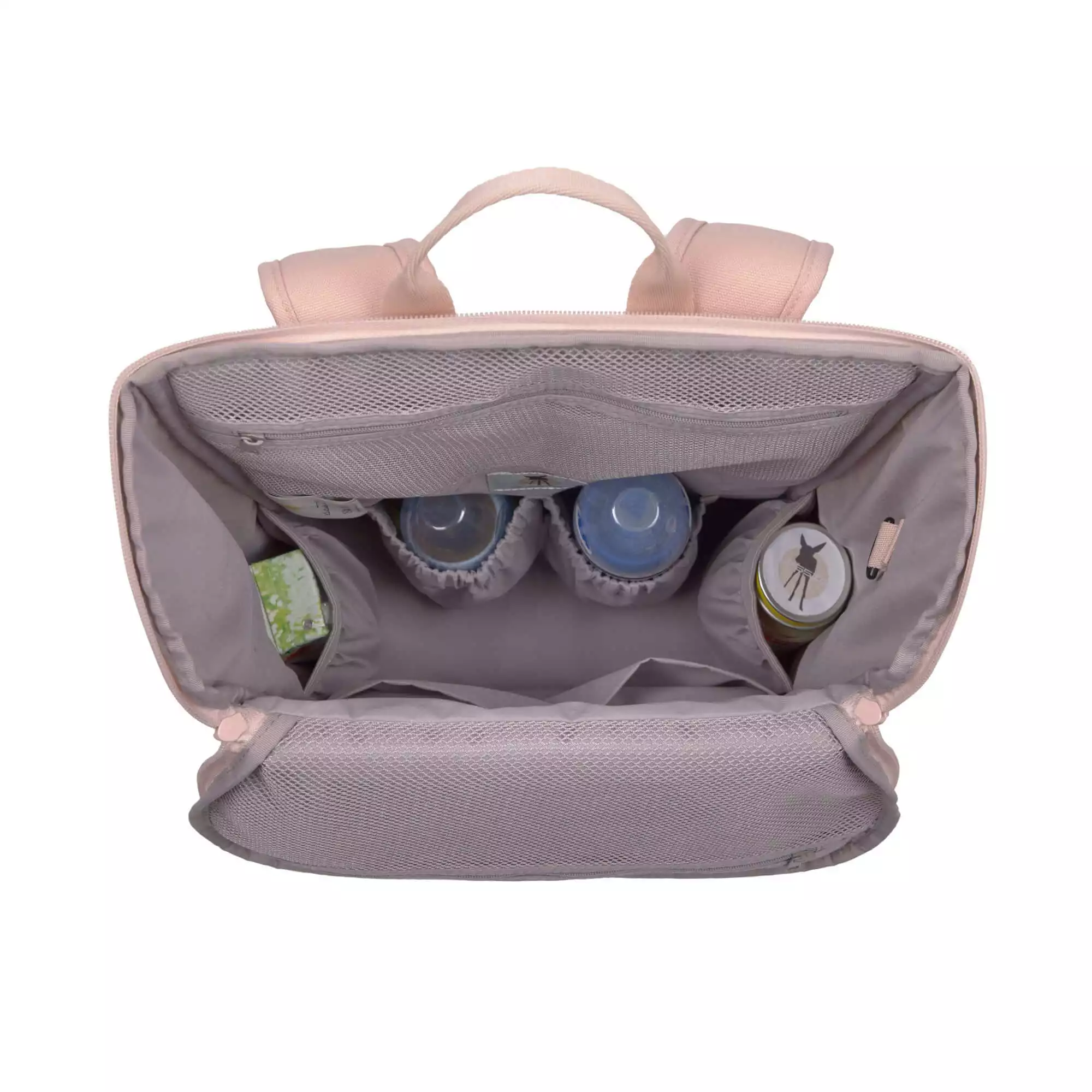 The Slender Backpack has an ingenious top opener that allows parents to immediately see and pick out what they are looking for inside. Once opened, the lid folds away to the front, giving quick and easy access to all the diaper accessories you need when you are out and about. Near the top are two practical mesh pockets for smaller items that might otherwise get buried.