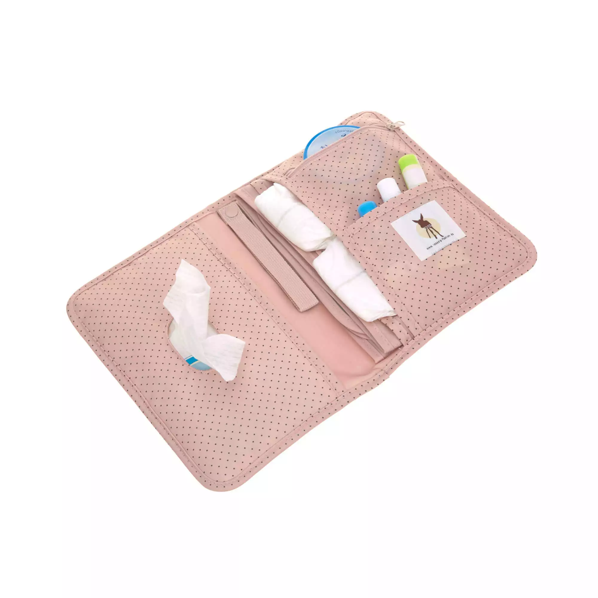 Functional features allow for a quick and easy diaper change. A compartment for wet wipes with a practical opening slit, various pockets for diapers and the like, a zipped pocket for odds and ends, as well as a tape for fastening a pacifier, make this a practical accessory. A water-repellent, soft padded changing mat that matches the bag, ensure an optimum diaper change