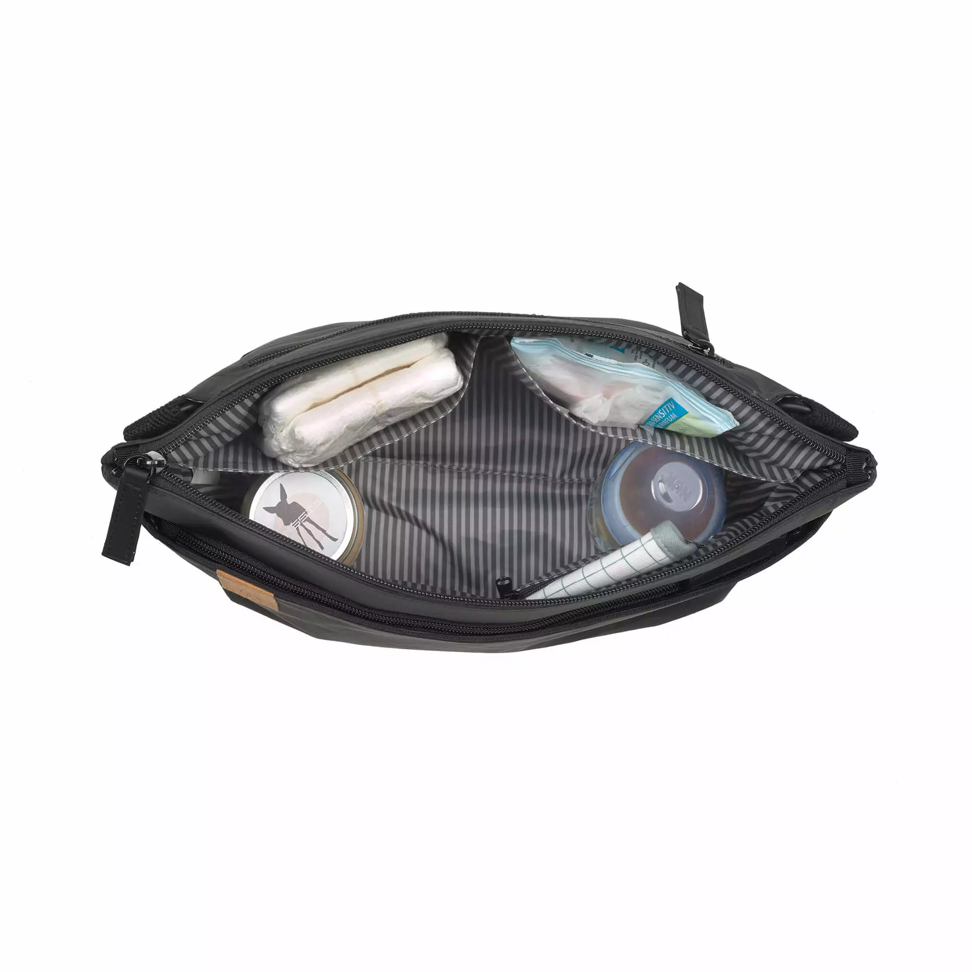 The large main compartment features many different sections and can be zipped for security. On the front and reverse side, there are also two zipped compartments for further items. The well thought-out layout as well as the stroller/baby carriage attachments and the many carrying options make the fanny pack a practical all-rounder. All essentials are close at hand.