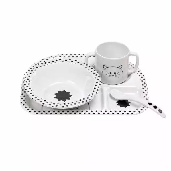The exceptionally lightweight tableware set with child-orientedcharacters is dishwasher safe and includes a plate divided into four sections, a cup, a small bowl and a spoon.