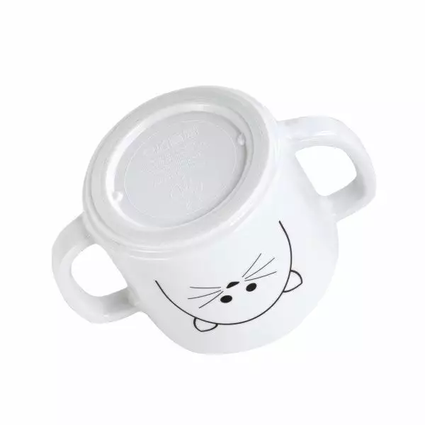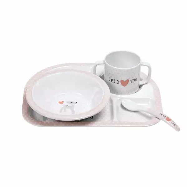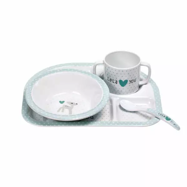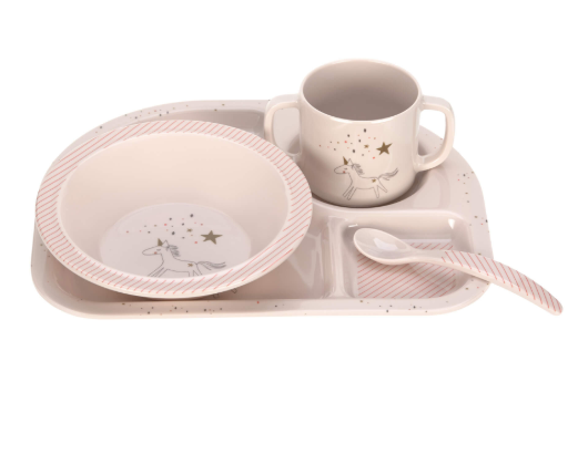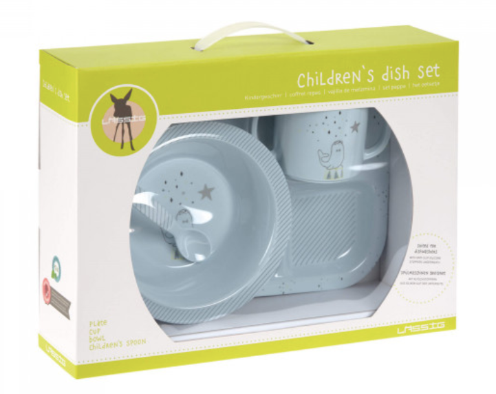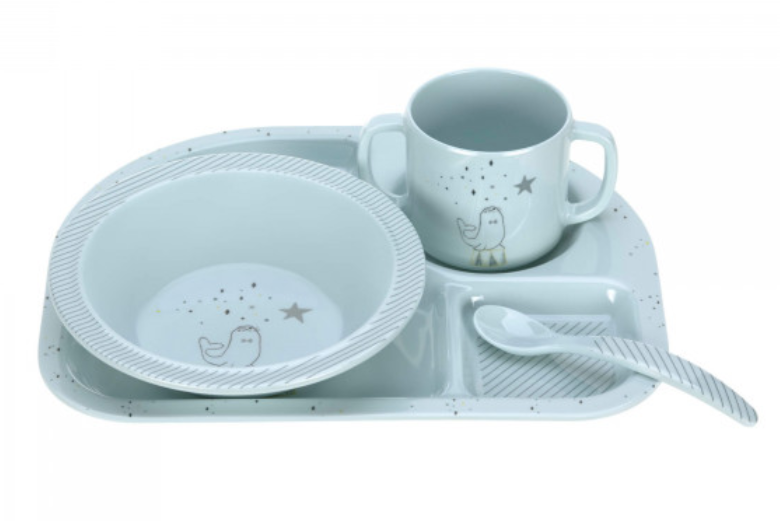 The tableware set includes a plate with four partitions, a bowl, a spoon and a cup with a handle on each side. The lightweight dish set is dishwasher safe. The undersides of the cup and bowl feature a non-slip silcone coating to keep them on the table. The tableware set is designed for children 1 year and up.