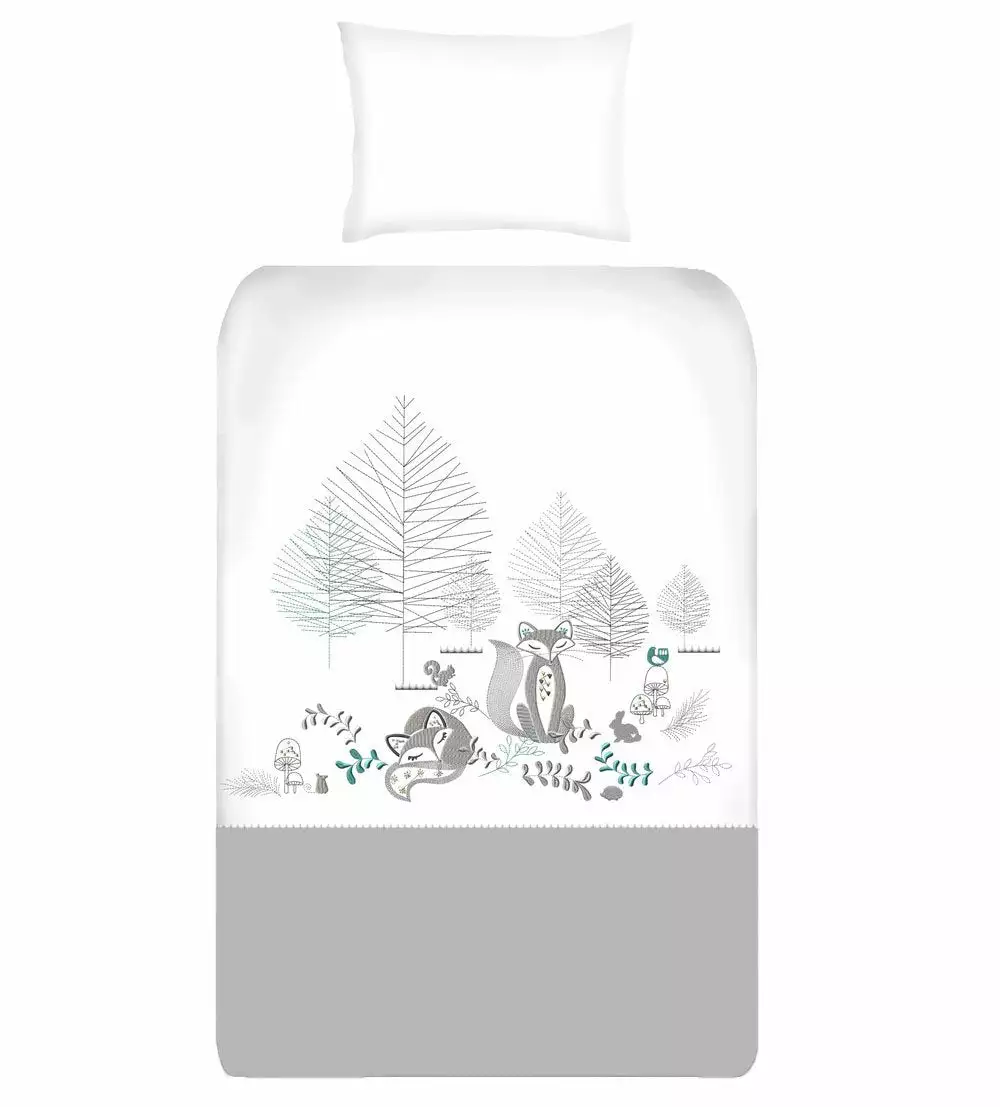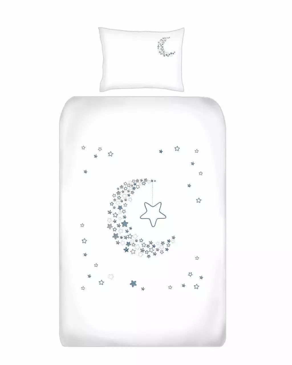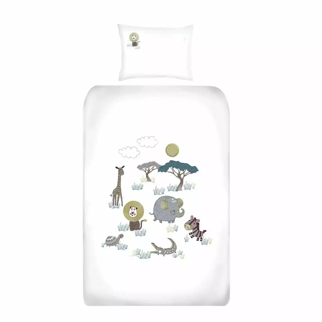 The cot duvet cover set design is created using a mix of soft satin and running stitch embroidery. A piped finish compliments the design and makes a product that will not only enhance the look of your nursery, but will ensure that your baby has the best sleeping environment possible.