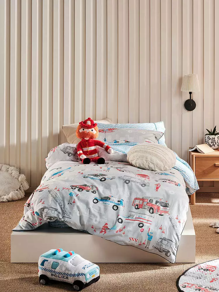 It’s an emergency – call in the sirens! All first-response units are coming to your rescue! This animated set enjoys hand-rendered and printed illustrations of emergency modes of transport on a grey cotton ground. It reverses to a squiggled crayon reverse in blue for another styling option and is trimmed with black cord piping – the perfect theme for your aspiring first-response worker.