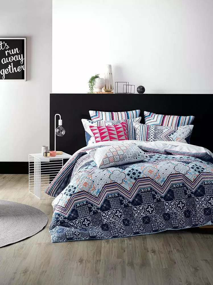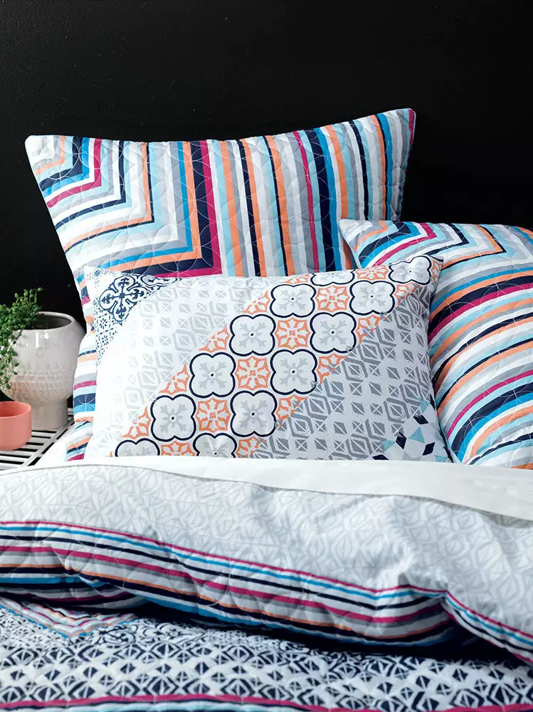 Zamora is a bold and colorful fashion print, full of style and energy. The pattern mix continues with the printed reverse, coordinating Continental pillowcases and cushions. The design is printed on poly cotton and quilted all over with a light fill providing the flexibility of an extra layer in winter or a coverlet in summer.