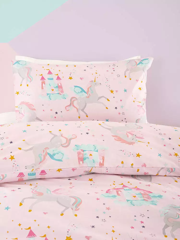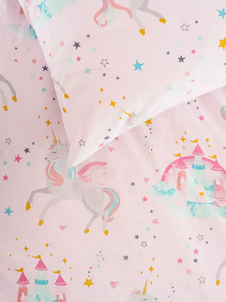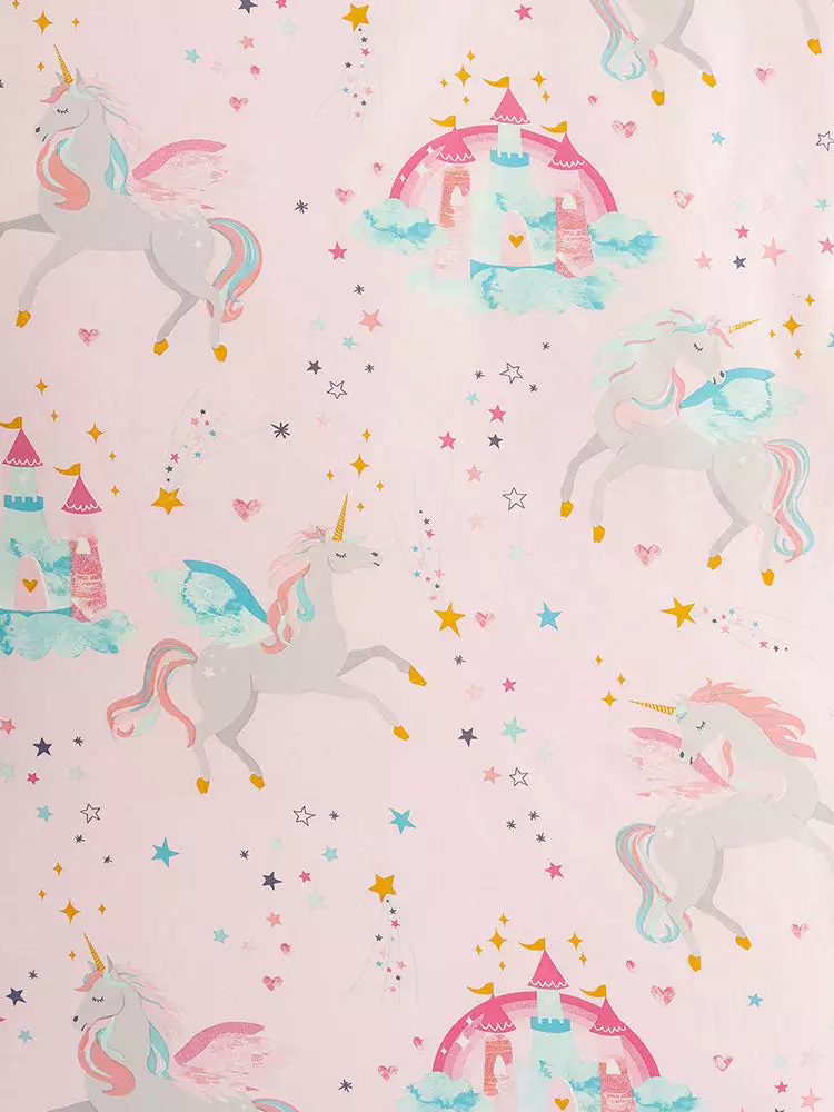 Ignite your little one’s imagination with this divine design. The magical pegasus is flying and prancing amongst watercolour castles, hearts and shooting stars in vibrant hues on a soft pink ground. This design is printed on cotton with the same design front and reverse.