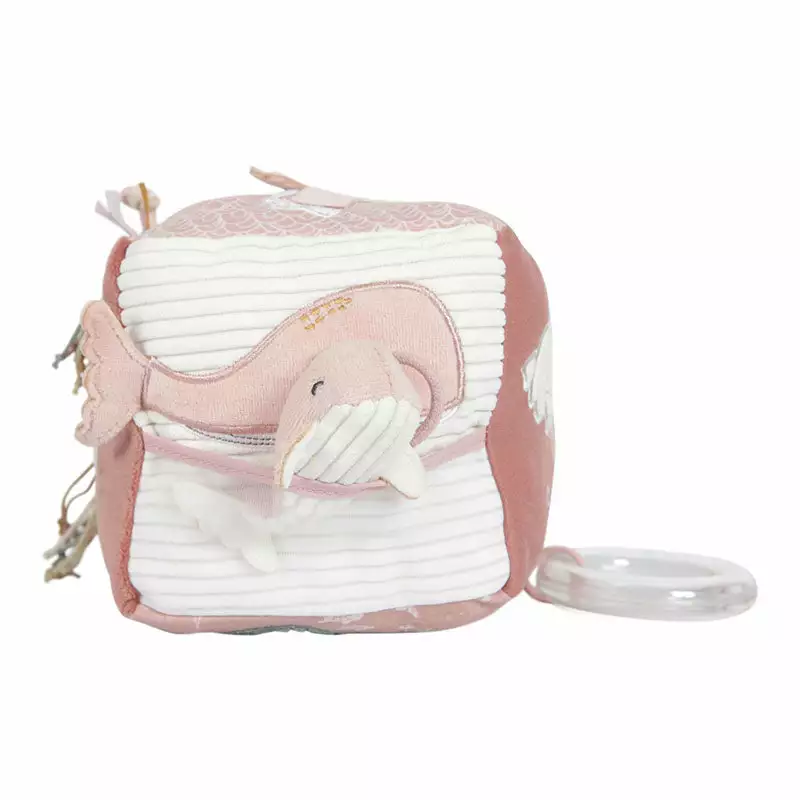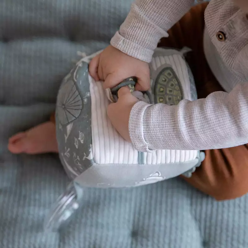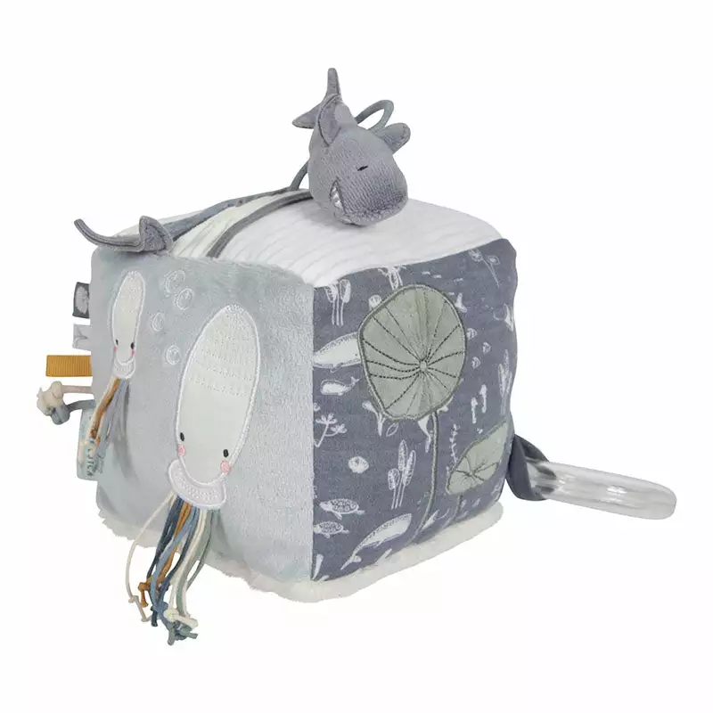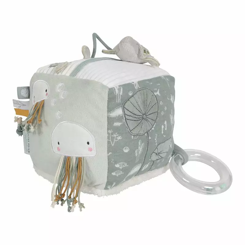 The soft cube of Little Dutch with underwater animals contains many activities that stimulate the senses of babies. There is so much to discover and play with: various labels, different textures, a mirror and a teething ring with beads that make a sound with every movement. There is also a small shark that likes to play hide and seek in its pouch. This toy remains interesting and provides a lot of fun in the box.