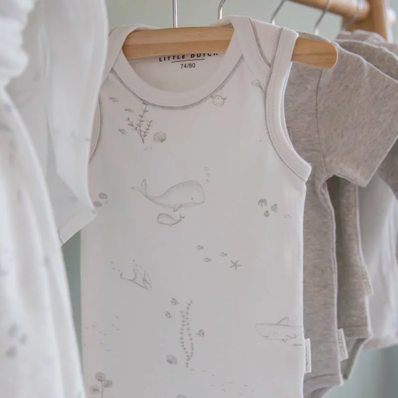 The beautiful Little Dutch bodysuits, made of high-quality cotton, are available in three varieties: long sleeves, short sleeves, and sleeveless. This indispensable garment for babies comes in various colors and prints and has a snap button closure at the bottom. To prevent skin irritation, no brand labels are stitched into the neck opening.