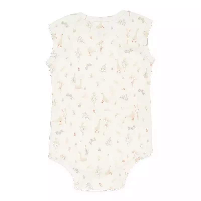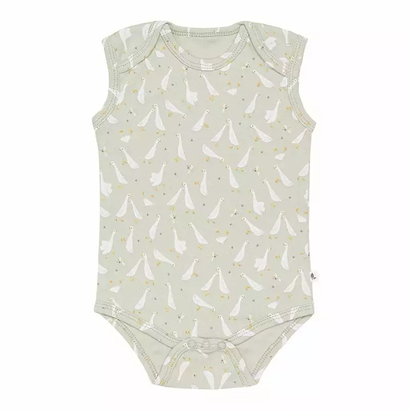 This pond-inspired bodysuit makes for a playful iteration of the classic style. Sprinkled throughout with walking and swimming geese, it adds a fun twist to your baby’s day-to-day rotation. This body is cut from certified organic cotton to a sleeveless silhouette with a crotch opening and snap buttons.