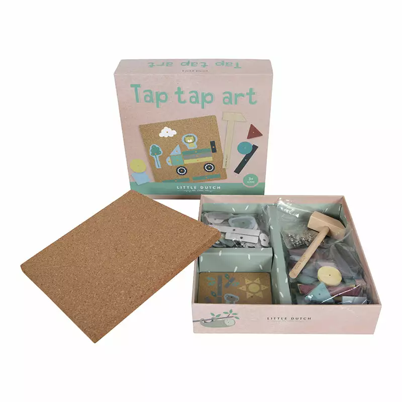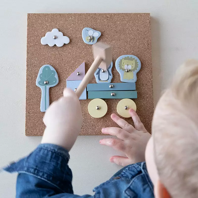 With this hammer-tapping game from Little Dutch, children from 3 years old can happily work on it. The set contains a combination of wooden geometric shapes and illustrated figures of high-quality cardboard. Children can let their imaginations run wild and create the most beautiful fantasy scenes. The game consists of a cork base, a wooden hammer, various figures of wood and cardboard, 4 examples and 70 nails.