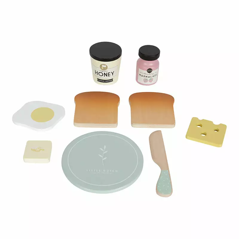 Start the day with a delicious breakfast! This wooden toaster turns it into a party and your child can make toast and add toppings. If you press the lever, the sandwiches will jump out of the toaster! The set contains a toaster in mint, including a plate, knife, two slices of bread, butter, slice of cheese, fried egg and jars of honey and jam.