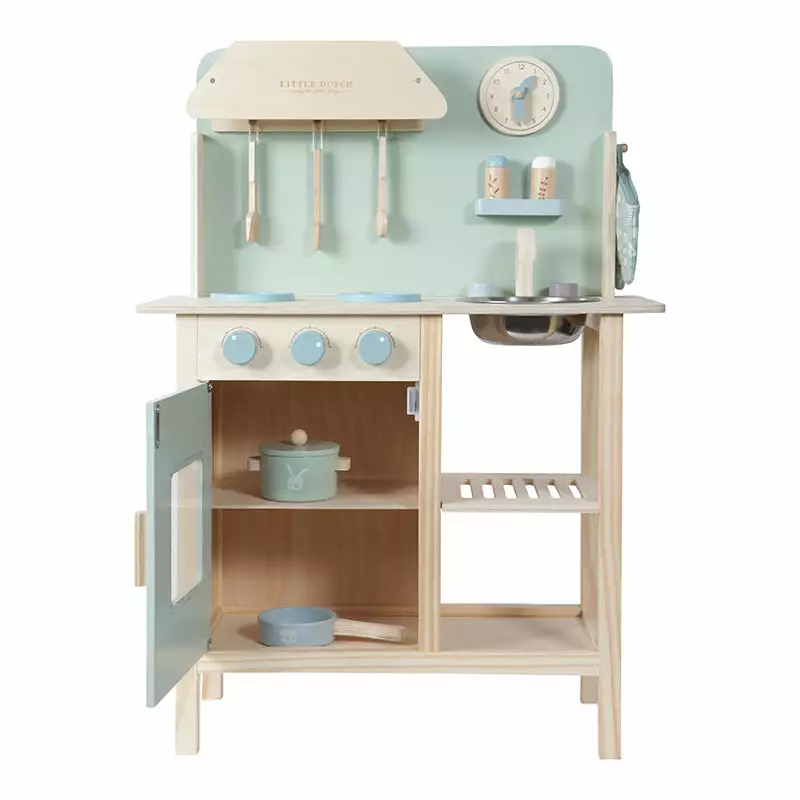 The Little Dutch kitchen fits into every living room or play corner and is ideal for every child to play with. The kitchen consists of an oven with a door, a storage shelf, a sink with faucet, a clock and a gas stove with two cooking plates. Includes utensils, pans, oven mitt and a pepper and salt set. The knobs of the gas cooker and the oven make clicking noises when you turn them. Completely stocked to cook a delicious meal for the little cook.