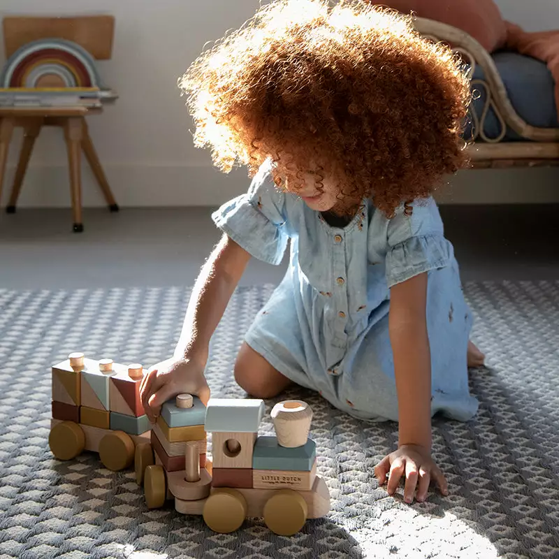 All boarding! Here is the beautiful wooden train from the Pure & Nature Collection from Little Dutch. With the blocks in various shapes and trendy colors you can stack, build and drive. Children are always challenged to make other wagon combinations. This stimulates fine motor skills and teaches them to recognize different shapes. It is also a nice accessory for the baby or children’s room. Made from FSC certified wood.