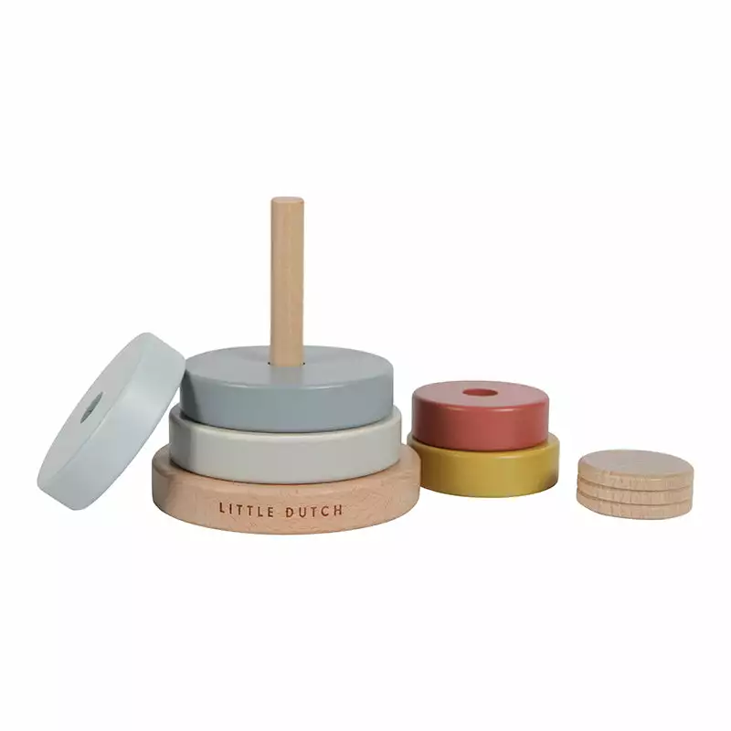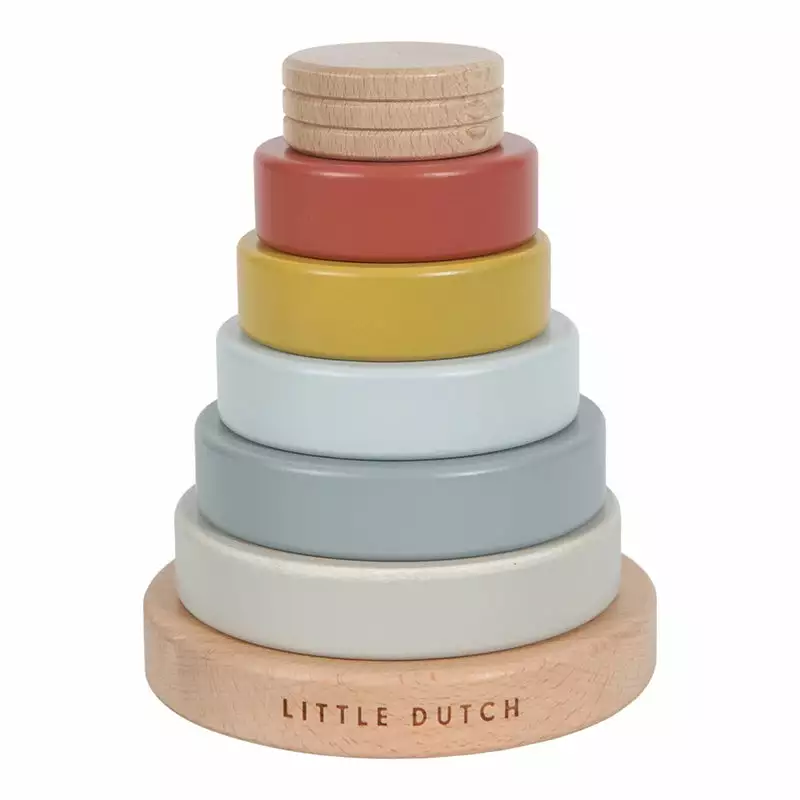 Stack the wooden rings in the right order on this modern stacking tower from the Pure & Nature Collection by Little Dutch. This toy playfully stimulates the hand-eye coordination and the fine motor skills of your child. The Little Dutch stacking tower is also very cute as a decoration in the nursery.