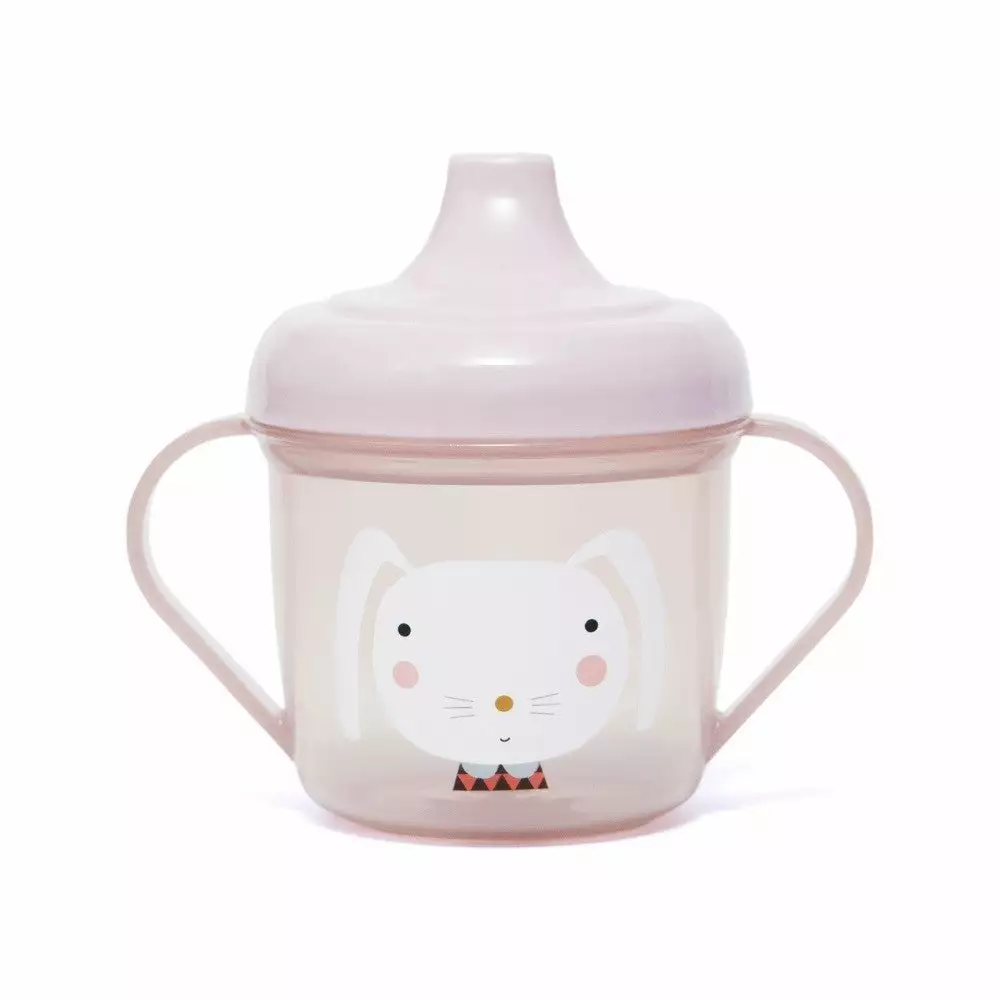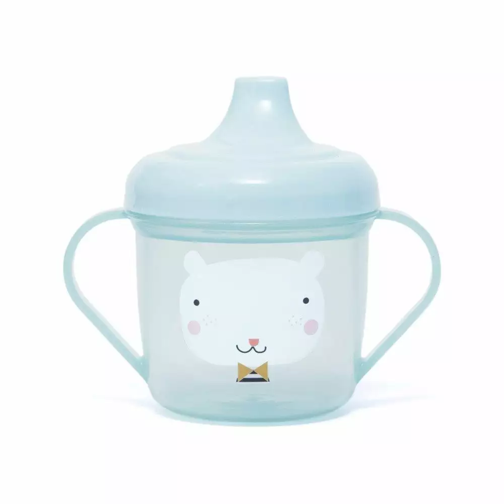Transparent training cup bear with a screw lid and a spout. The cup has two handles to hold the cup. Cup holds 190 ml – 6,4 oz, tritan bottle + PP lid. Dishwasher proof not suitable for microwave.