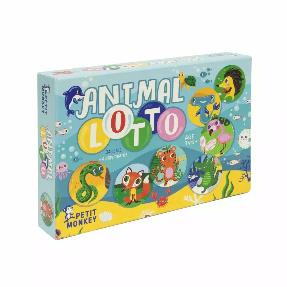 This animal lotto by Petit Monkey is a classic picture matching and memory game for young children. The four play boards, forest, in the sea, jungle and wild animals are beautifully illustrated by Helen Dardik. Each player chooses a play board and all 24 cards are laid face down on the table. The first player turns over a card to see if it matches one of the six images on the board. It it doesn”t fit, the other players have to remember the position of this card if this belongs to their play board.