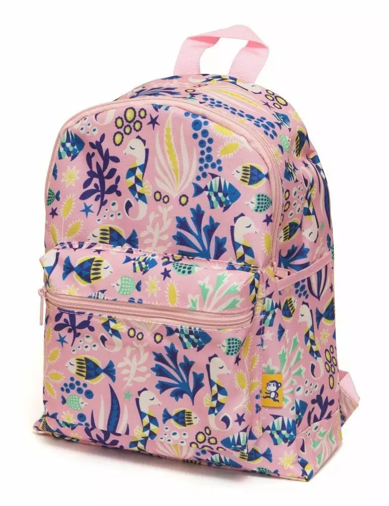 This fresh under the sea backpack with seahorses, fishes and under water plants on a lovely soft pink ground is made of a firm 420D oxford fabric + PVC coating + matching lining.