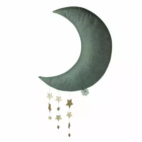 Beautiful Wall Hanging Grey Moon with stitch detail and gold hanging stars.