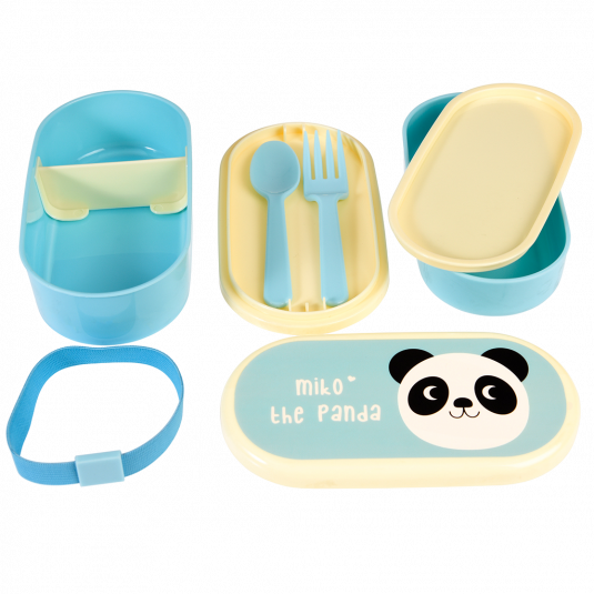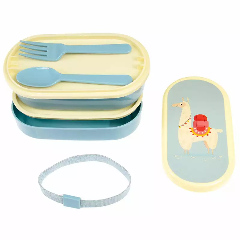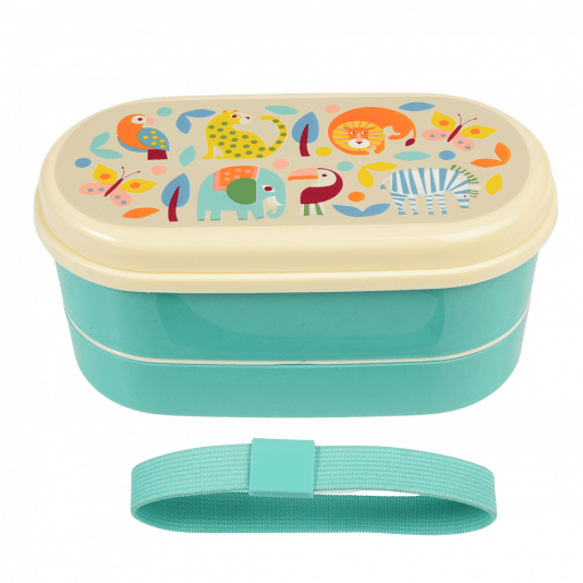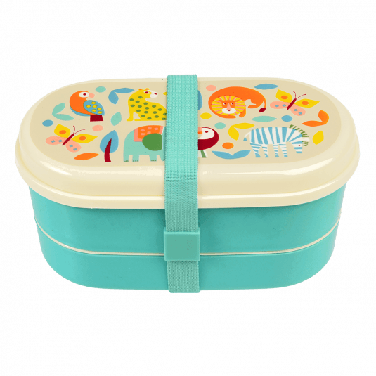 Kids will love this dual compartment bento box with fork, spoon, elastic strap.