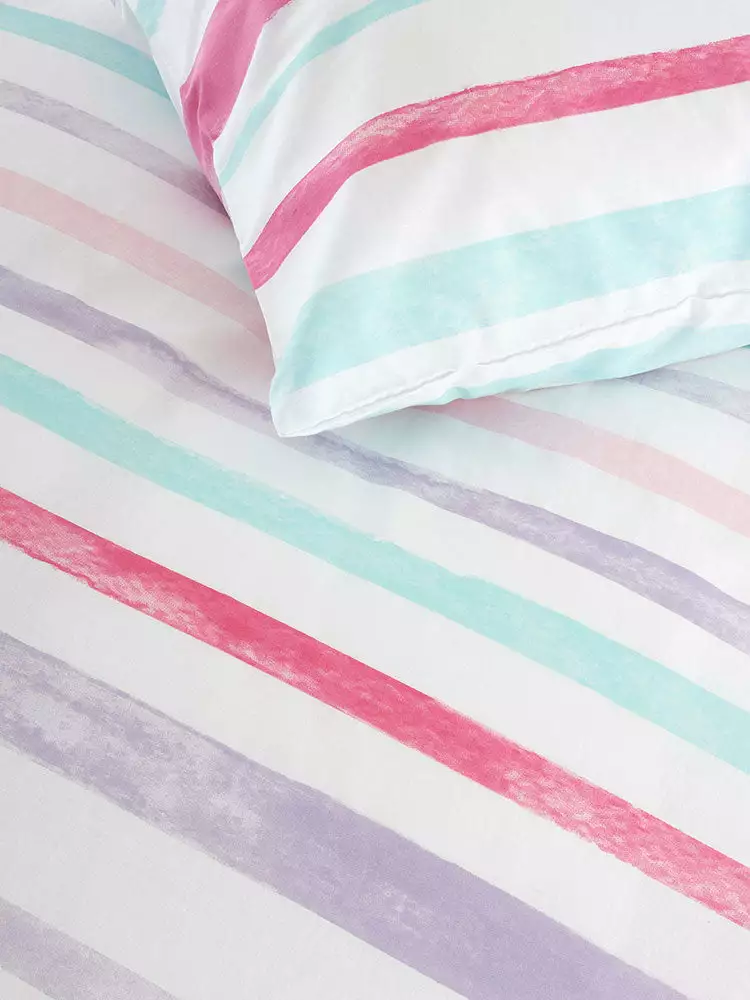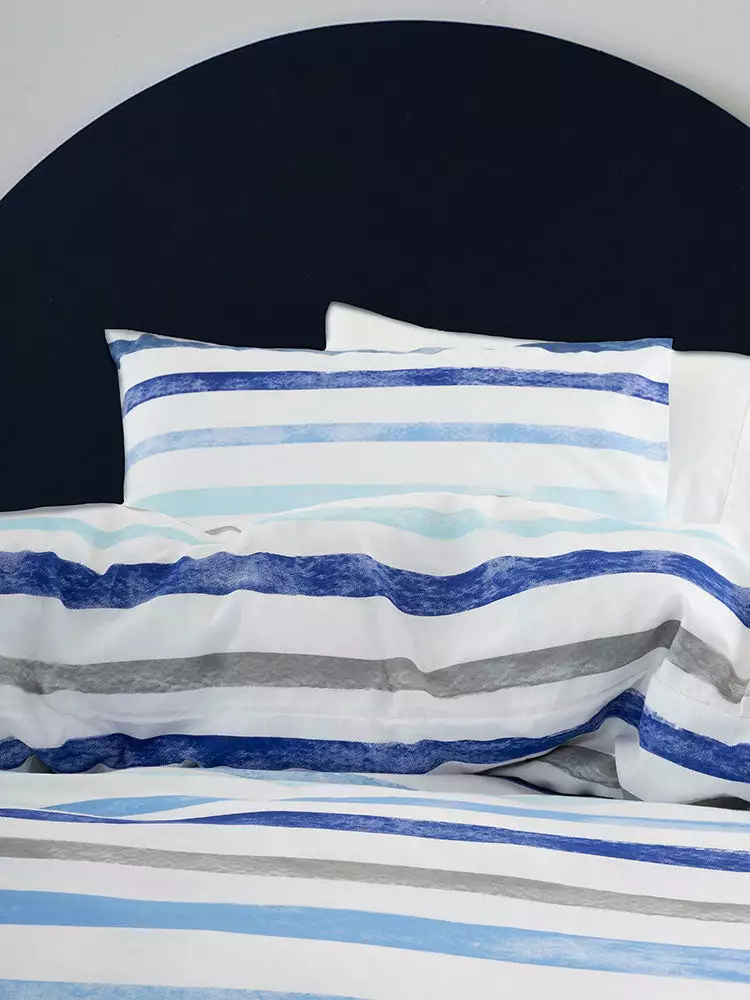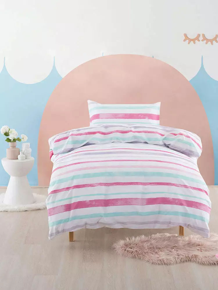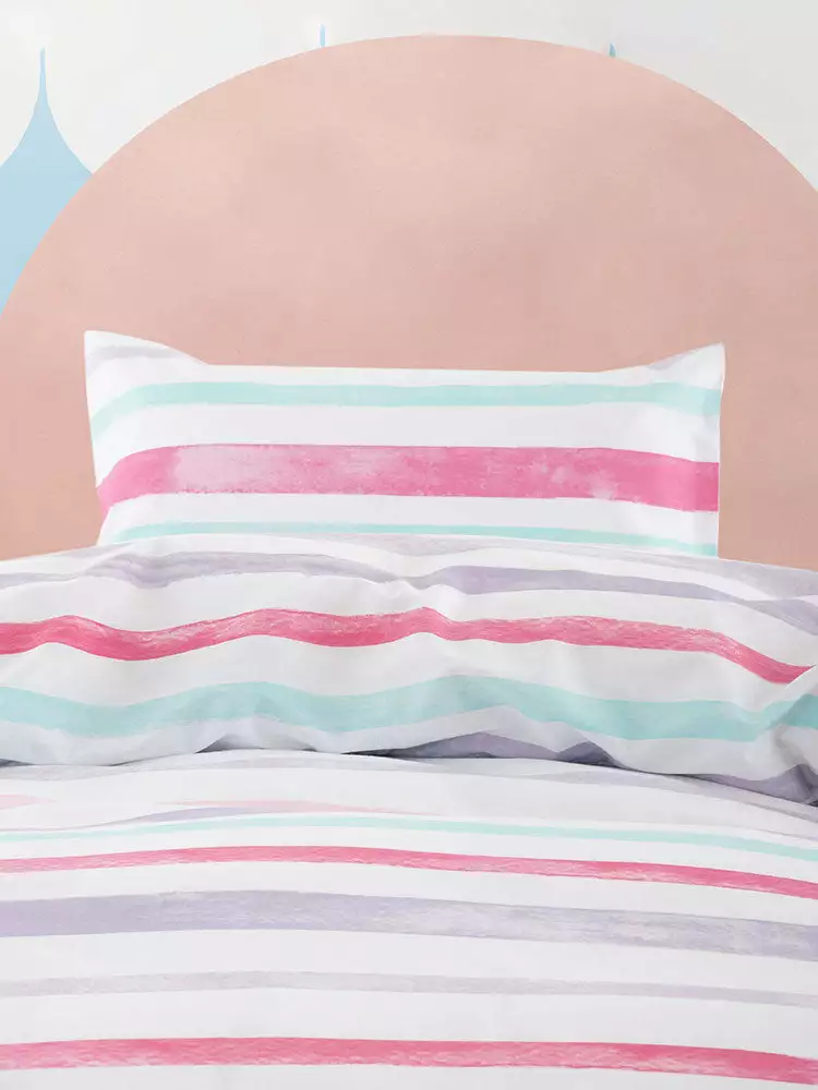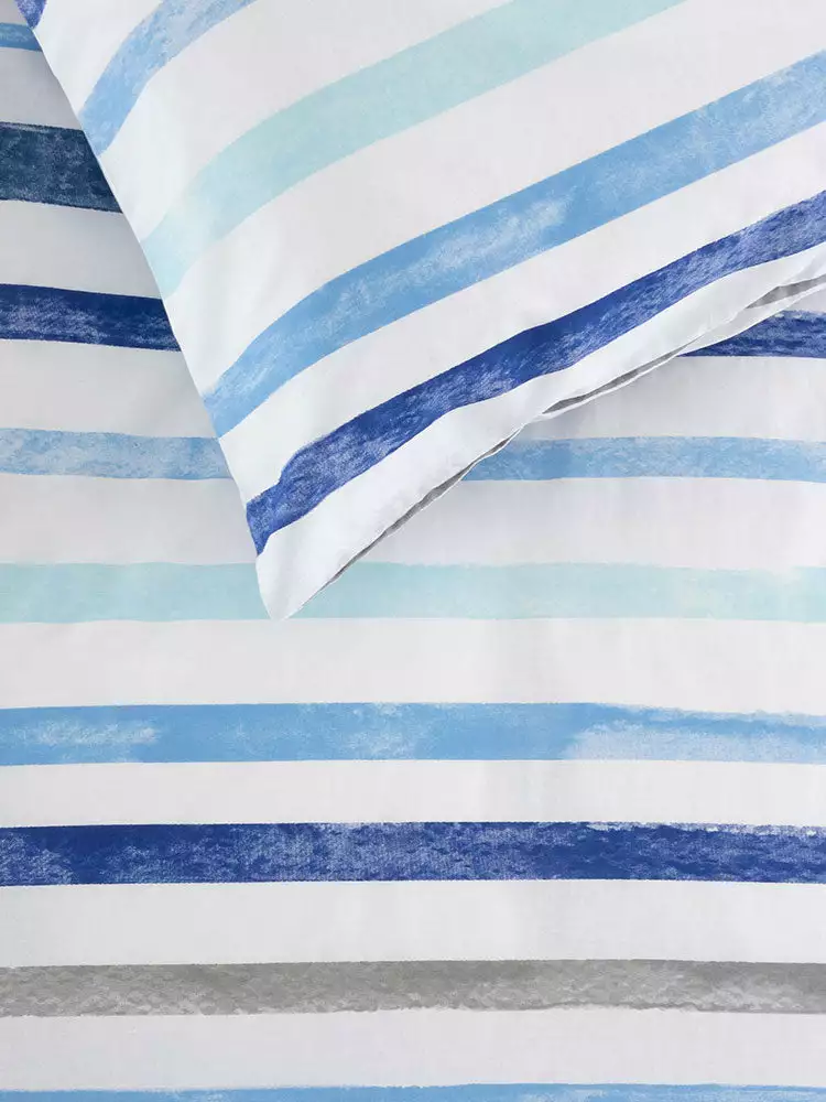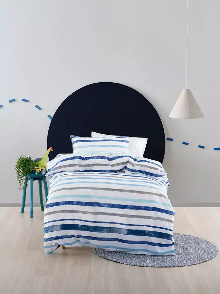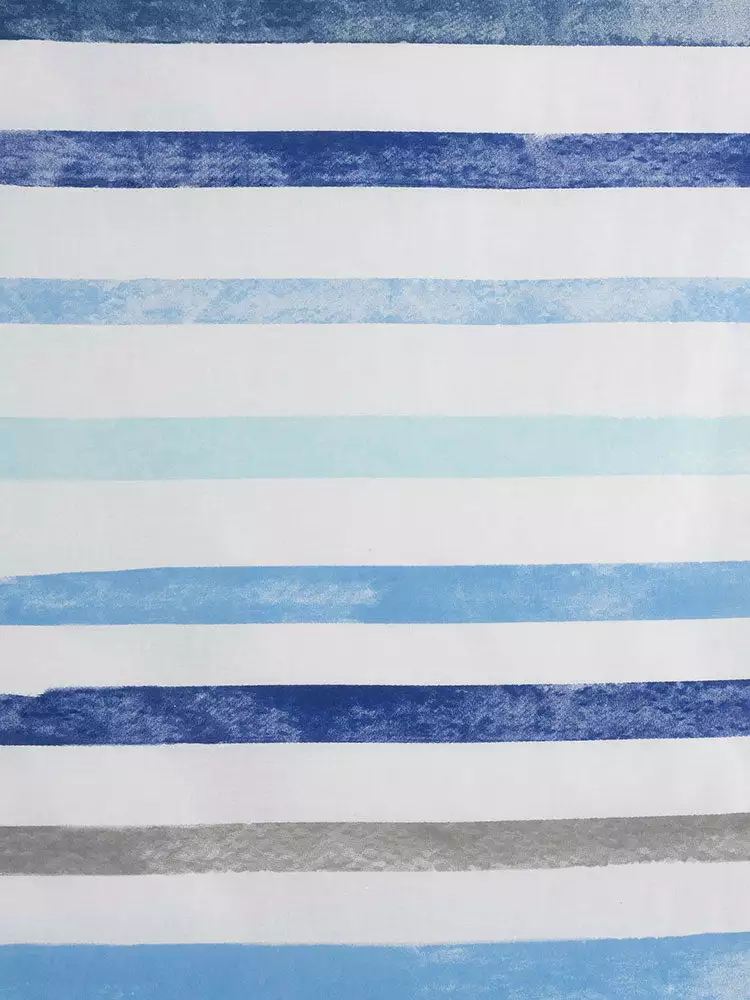 This animated horizontal stripe in a range of navy, aqua, and grey watercolor hues will add a fresh and vibrant look to your child’s bedroom. Contemporary and fun, this design is printed on 100% cotton and features the same print front and reverse.